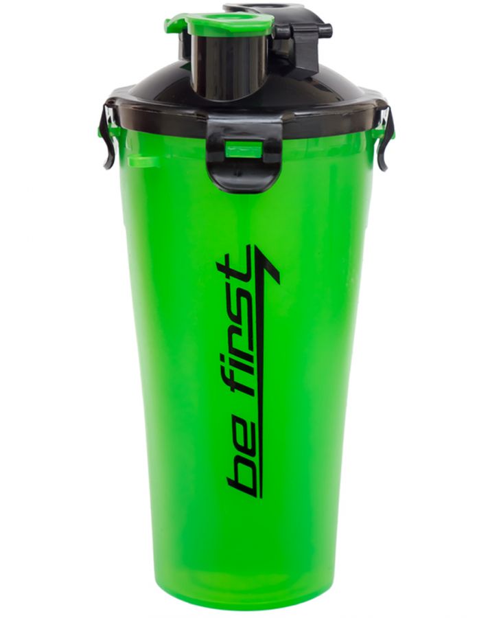 Новинка от компании Be First – двухкамерный шейкер! Отличительная особенность данной модели – наличие двух независимых камер равного объема (350 мл) с отдельными носиками для питья. Носики снабжены плотными клапанами разных цветов, так что Вы не перепутаете, в какой камере что налито. Это позволяет разделить протеин на два приема. А еще лучше – взять с собой на тренировку воду в одной камере и сок в другой, или изотоник в одной – в другой BCAA. Поле для экспериментов – необъятное. Каждая камера оснащена своей сеткой с мелкими ячейками – ее при необходимости можно вынуть.